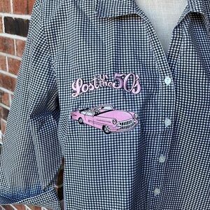 Las Olas black and white checked button up shirt. Lost In The 50’s application done in pink, the Cadillac has rhinestones for headlights. So cute size Medium, P2P 22”, length 25”, sleeves 16”. Excellent like new condition.