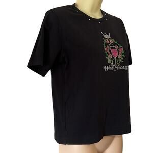 Black combed cotton knit top with short sleeves and “wine princess “ embellishments