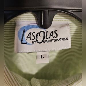 Las Olas Women's Green White Stripe Large Button Down Shirt Embroidered Daisies