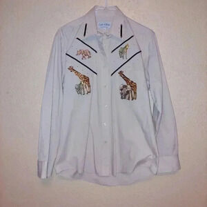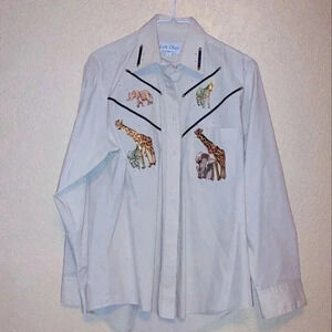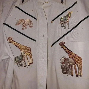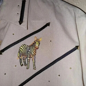 Cute tan Button Down Shirt with Chest Pocket, Featuring Black Safari animals Embroidered Applique Patches with Beading on Front and Back Shoulder in Crisp Cotton Blend