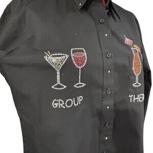 Vintage Las Olas brand black bejeweled novelty blouse - Group Therapy & cocktail glasses done in sparkling rhinestones! Tagged Size M - cotton polyester blend - perfect for your next happy hour party or casino visit! Gently worn - no flaws.