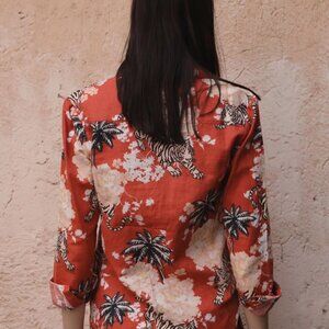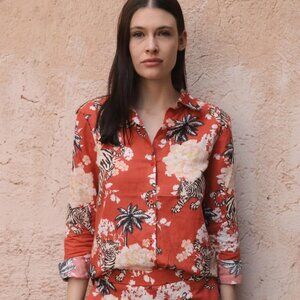 The stylish cotton-linen long-sleeved shirt in Las Sureñas' iconic tiger print. This collared shirt with dazzling, iridescent buttons is a versatile option pairing perfectly with pants or shorts. This romantic print is sure to turn heads, making a feminine and graceful statement with Las Sureñas' signature designs that incorporates hints of black and cream shades. This shirt is a versatile garment excellent for any occasion whether you're going for a casual or dressed-up look.