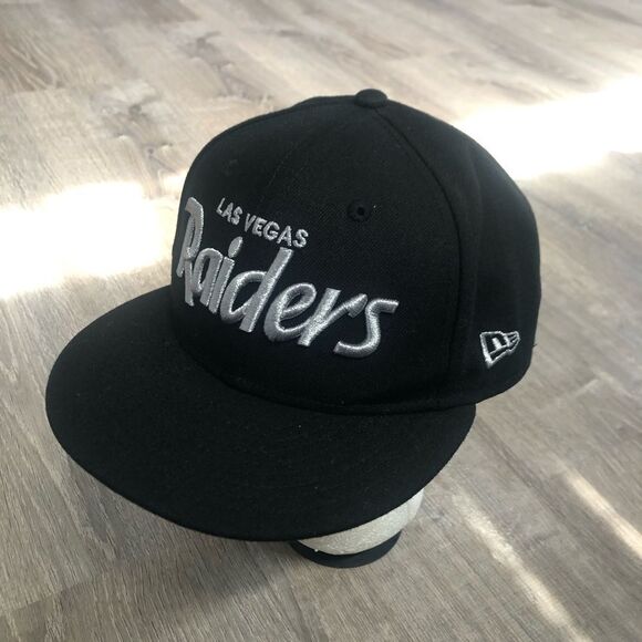 New Era Las Vegas Raiders NFL Script 59Fifty Fitted Baseball Hat Cap. Size 7- 1/2. Black with Silver lettering. No rips or tears. Some discoloring on underside of bill. See photos for condition.