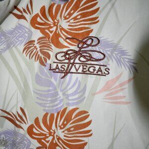 Chill Las Vegas resort shirt featuring tropical orange and lavender floral print on a light background. Lightweight and breezy — perfect for vacations, summer parties, or casual days. "Las Vegas" embroidered on the chest for that classic tourist vibe! In great condition with lots of life left.