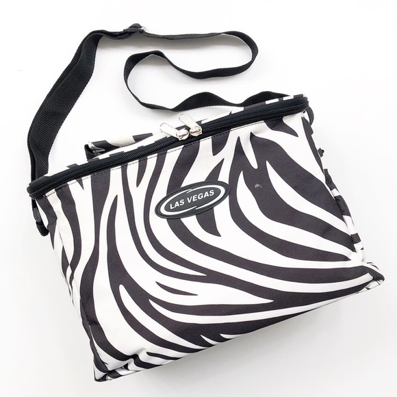 Las Vegas zebra print cooler bag 12 x 8.5 x 7.5 inches Adjustable strap Good pre owned condition (several marks on exterior from use)
