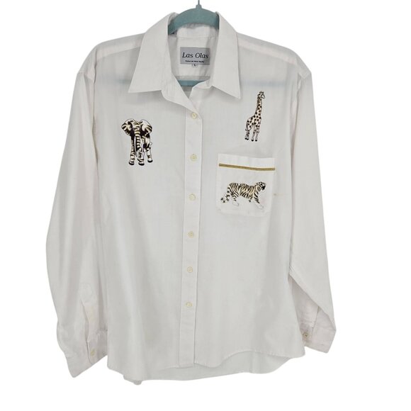 Las olas mens large white animal elephant tiger giraffe embroidered gold glittery patch work safari button up Good Preowned Condition has some staining May show normal wash wear color may appear differently depending on light cotton blend