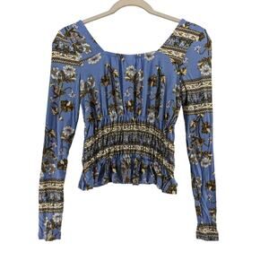 Lascana Floral Fitted Blouse XS Blue Green Smocked Button Up Long Sleeve Ruffled