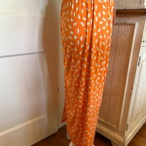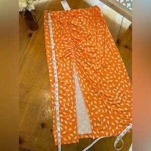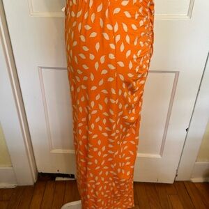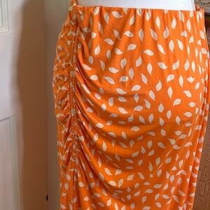Beautiful vibrant orange maxi skirt featuring a chic leaf print.