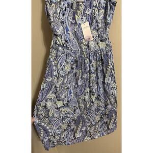 This Lascana dress is perfect for any occasion, whether it's a casual day out or a formal event. The dress is a size 4 with a halter neckline and pullover closure. The blue, purple, green, and white paisley print is perfect for the summer and spring seasons, making it a great addition to your vacation or beach wardrobe.