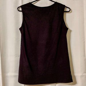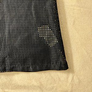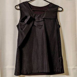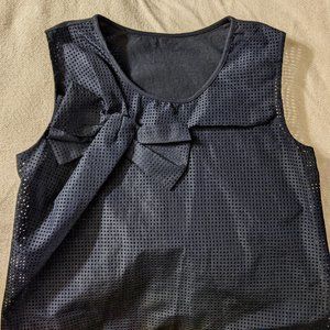 This unique top can go from the office to drinks with friends/date night. The front is a laser-cut, perforated polyester that looks like mesh, but is much higher quality. The back is combed cotton, like a t-shirt. A decorative bow dominates the front. The slight A-line shape is very comfortable and roomy enough for a camisole or tank top underneath. Color is very dark navy; almost black. Like-new condition. From the South Korean boutique brand ZOOC. 23.75 inches long. 17 inches wide at bust.
