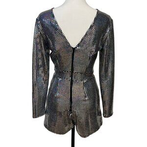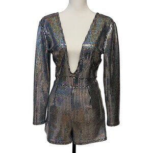 Lashes Deep V Metallic Sequin Romper Long Sleeve Mini Short Holographic Shimmer