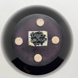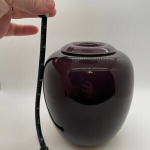 Beautiful plum color glass vase with rolled over rim. Classic 70s' home design. Rich color and wonderful weight and feel in the hand. Subtle color shifting from lighter tones at the shoulder and deeper stronger shade at the bottom. Slight translucence. The size is 6" tall and 5" in diameter. Very minutiae chip (see pic) Beautiful piece.