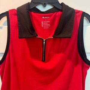 Laslulu Sleeveless Golf Shirt, Size L, EUC. Red shirt with black trim and 3/4" zip up closure and round hem. Measures: 18 1/2" arm pit to arm pit and 24 1/2" length.