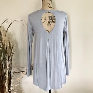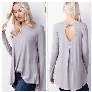 Silvery gray eco-friendly bamboo top. Crew neck, full length sleeves, cut out back with pleat detail. Rounded hem. Must have super soft top! 96% bamboo 4% spandex. S-2/4, M-6/8, L-10/12