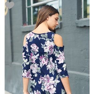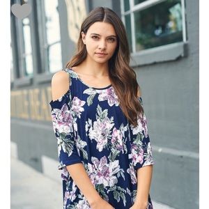 Super cute navy Floral print cold shoulder Tunic top. Polyester/ Spandex soft and slinky feel, made in USA. Runs loose. Size down recommended