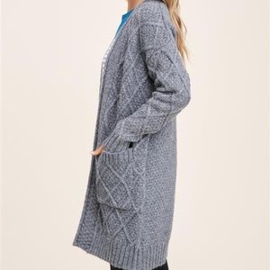 Brand new with tags! This Charcoal Gray Long Cable-knit Cardigan Sweater is so soft and cozy. it has cableknit throughout the front and 2 front pockets.