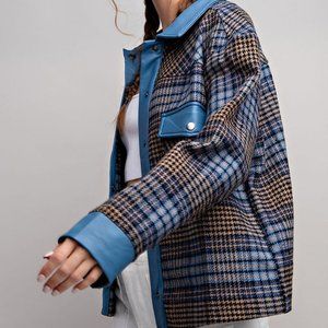 Welcome the Faux Leather Trim Plaid Jacket, featuring a striking plaid pattern with faux leather trim. Crafted with comfort and style in mind, this jacket is lightweight and perfect for any season. An ideal addition to your wardrobe.