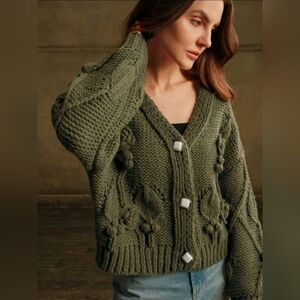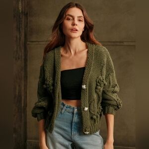 Stay cozy and stylish with this chunky knit olive sweater. Short style. Cable knit. crochet detailing. Soft , not itchy.