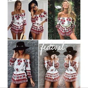 Brand New Bohemian Off The Shoulder Floral Print Romper. Features long sleeves and an elasticized waist. A perfect addition to any closet for the summer!