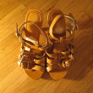 Heading to the trash shortly Worn twice, no box or bag, MICHEAL by MICHAEL KORS tan leather high heel sandals, size 36 (6) Wood base mini platform with tan leather straps each with adjustable buckles, 4 inch wood heels a few scratches on the heels