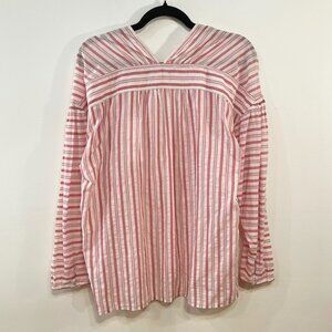 Vince popover top featuring a v-neck, drop-shoulders, full-length sleeves with button cuffs, and a lightweight, slightly sheer 100% cotton fabric in pink and red stripes on an off-white ground.