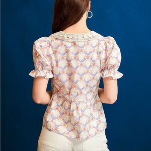This enchanting floral print blouse features a sophisticated V-neckline with elegant tie detail and charming puff sleeves.