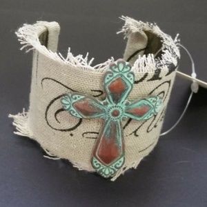 Western / boho vibes are all over this one! Burlap material and a copper tone patina cross covers this wide metal cuff bracelet. A absolutely stunning piece!