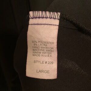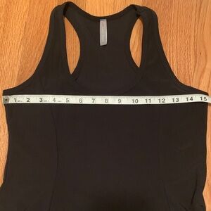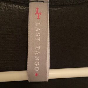 Chic black racer back tank/tunic by Last Tango. Sleeveless design. Perfect for versatile styling. Like new condition overall, except for the material tag-see photo. This is a size large, although to me it seems smaller than that…see measurements. The material feels soft, smooth and a bit stretchy.