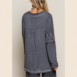 Their signature soft fabric of Rayon/Spandex in a Modern Charcoal color with an Aztec print around the arms, at the edge of the cuffs and the bottom of the hemline. The same pattern in that gorgeous Mocha Java Hoodie coming soon! Who doesn’t love a comfortable, & uber soft long sleeve graphic tee for the Fall & Winter.