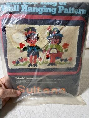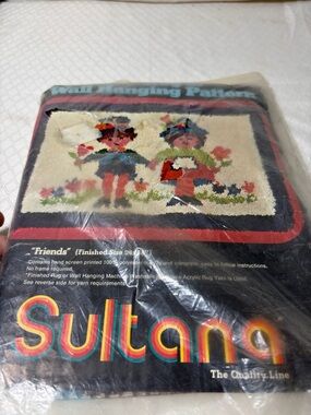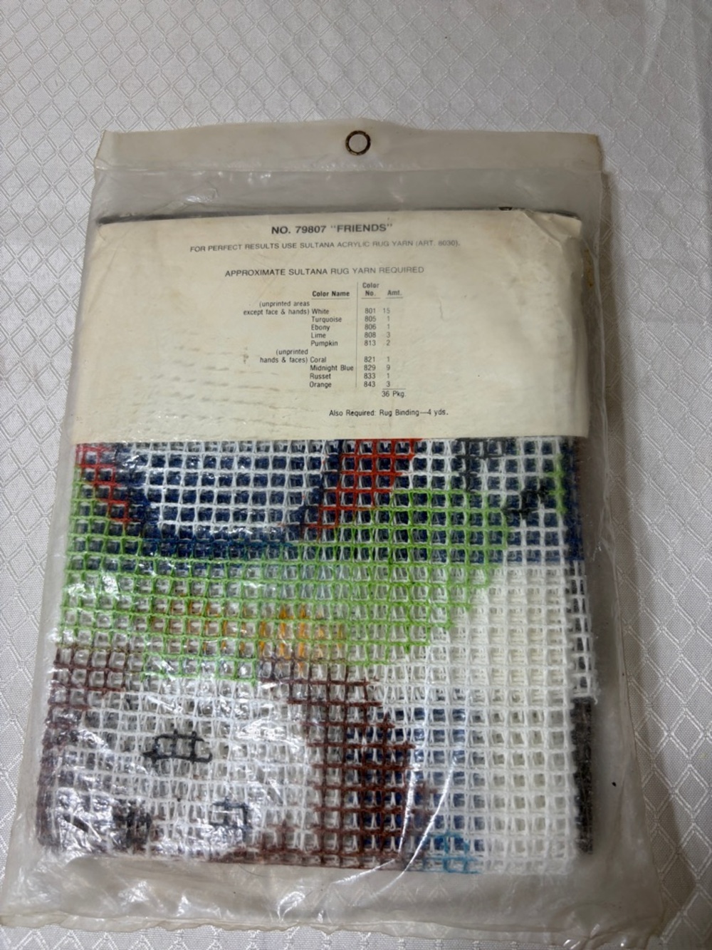 Pre-printed latch hook rug canvas titled "Friends" in multicolor. Features blue, green, brown and cream tones for a vibrant finished piece. Ideal for home accent projects and easy to personalize. Includes pre-marked grid to guide stitching.