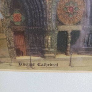 Really neat old, circa late 1800s era print framed in a wood glass frame. Unknown artist , has words Rheims Cathedral and number 3932. Lithograph ? print looks great, Back part has damaged of original paper . Nicely aged piece .Frame outside:14-1/2''x 18-3/4'' The picture 7.5"x10'