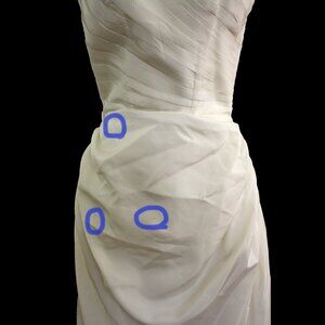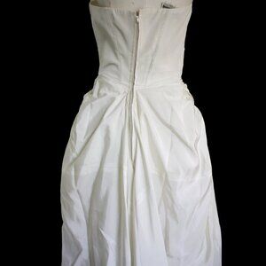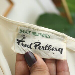 40s / 50s Fred Perlberg Dance Originals dress. This line was typically formalwear dresses but the color of this one gives it a bridal look! Its a pretty bright ivory but not may not be appropraite if you're looking for stark white. Beautifully pleated bodice and bustling at the sides and back to create a fabulous front draping.
