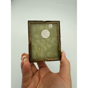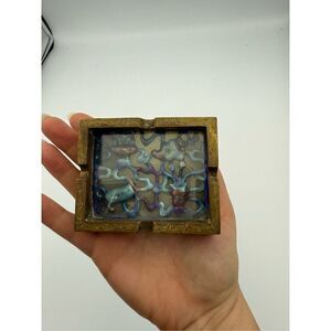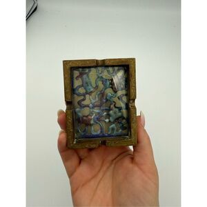 A unique vintage inlay brass and glass ashtray made in China. Underneath a sheet of clear glass, a beautiful mosaic floral relief of various colors of blue, turquoise, purple, and creamy brown. The piece is framed by a repetitive, embossed floral and leaf pattern.