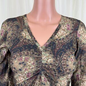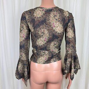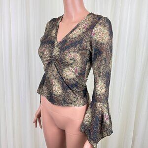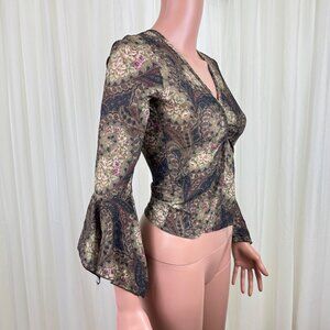 Y2K 90's Younique Bell Sleeves V-Neck Top Paisley Blouse Size Medium Green