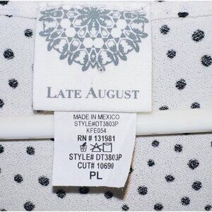 Elegant and versatile, this Late August blouse features a classic polka dot pattern with a stylish tie front. V-neck and short sleeves for a sophisticated look.