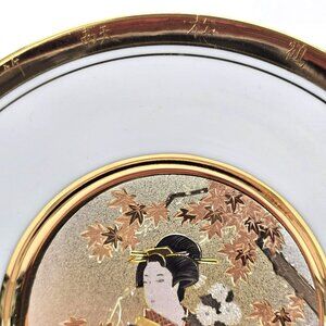 This decorative plate features intricate Chokin art with 24K gold trim, showcasing a Japanese floral calendar theme with elegance and cultural significance. A Shogun plate from the Hamilton Collection. Numbered.