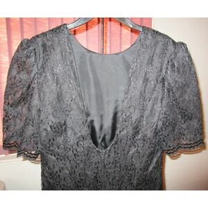 Late Edition Vtg 80s Black Lace Cocktail Dress Low Cut V Back USA Union Made 14