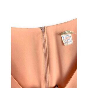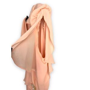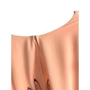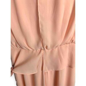 Peach color chiffon, faux wrap top with modesty panel, back zip, flutter sleeves, front dripping and front waist draping with the typical late 70’s iridescent sequin floral appliqué with iridescent glass bead and a cubic zirconia center. Thin shoulder pads. Stunning and in amazing condition. Slight stitching fray on on part of the appliqué (see photo), not noticeable unless your face is right on it.
