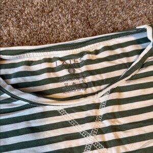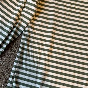 Comfortable pajamas tee with forest green and cream stripes. Features a round neckline and casual style. So comfy!