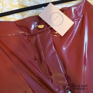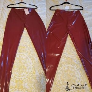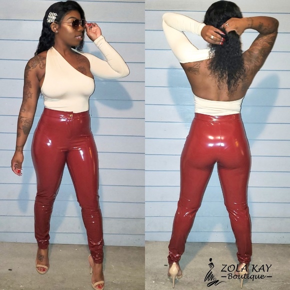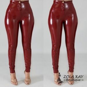 Semi stretchy fabric, high waist stretch pant, finish with a front zipper closure. Color is Burgundy