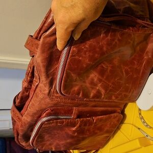 Roomy distressed leather raspberry purse with multiple zipper compartments. Fully lined with unique flower cotton print.