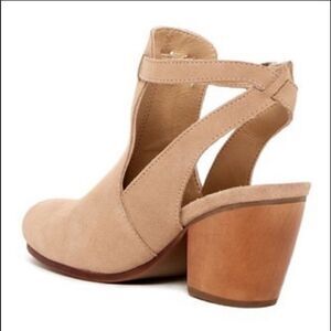 These have a 3” wooden heel and strappy back. There’s some darkening on the toes, but that’s the style of the shoe. These have been worn to try on only and are new. Sold at Nordstrom and Anthropologie!