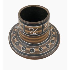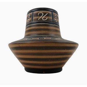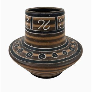 This Unbranded Latin American Mexico Pottery Vase exhibits a rich brown and tan clay terracotta finish, carved with Inca Aztec motifs, adding a touch of cultural history to your decor.