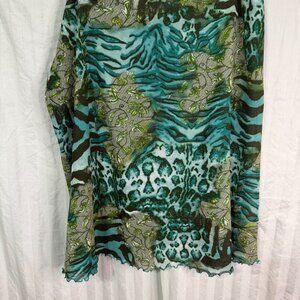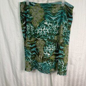 Add a bold pop of style to your wardrobe with this eye-catching green and teal animal print skirt. Featuring a mix of leopard and zebra patterns, this skirt is perfect for pairing with a simple top and heels for a night out, or with sandals for a casual day look.