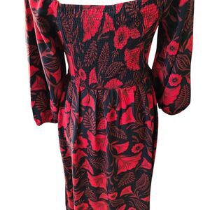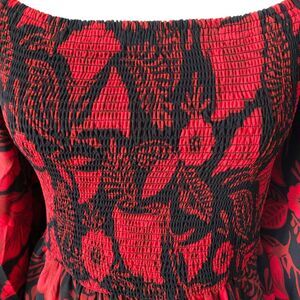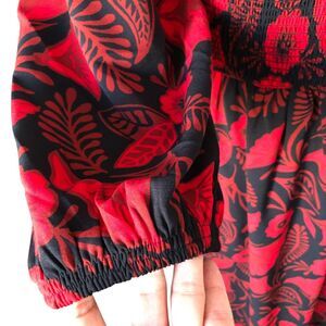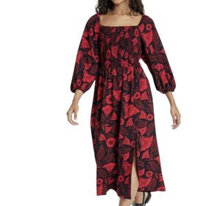 Latino Heritage Month Red Floral Puff Sleeve Smocked Slit Midi Dress Sz S NWT