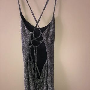 Selling this dress that was purchased for NYE. Very trendy but sexy at the same time! Super flattering and accentuates the curves. It's in the color black but has specks of silver - the perfect party dress. The back is open and criss crossed. Fabric is 60% Nylon, 35% Polyester and 5% Spandex. In the size Small and midi length.