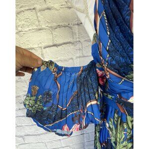 Lux floral print maxi dress comes in accordion-pleated chiffon fabric and features a plunging v neck with a gold-tone hardware halter neck trim, short off-shoulder sleeves, and removable waist tie with pearl beaded ends.