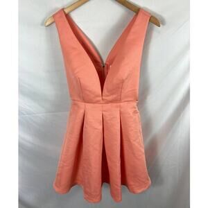 L'atiste Peach V Neck Dress gathered skater skirt, plunging front and back. Zipper/hook in back great shape