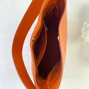 Latouche Burnt Sienna Braided Seam Shoulder Bag in good condition. Flaws include storage wear crease across bottom front and some creasing on bottom back side. Synthetic faux leather. Magnetic button closure. 1 interior zip pocket and 1 interior slip pocket. Approximate measurement pics included in listing for reference.