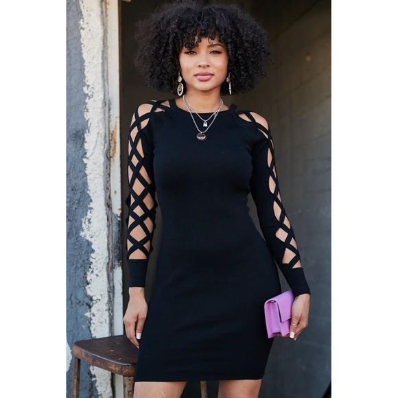 When you need to make an impression, reach for a statement piece like this dress. This dress is a bold take on the standard little black dress with its eye-catching lattice cutout sleeves.